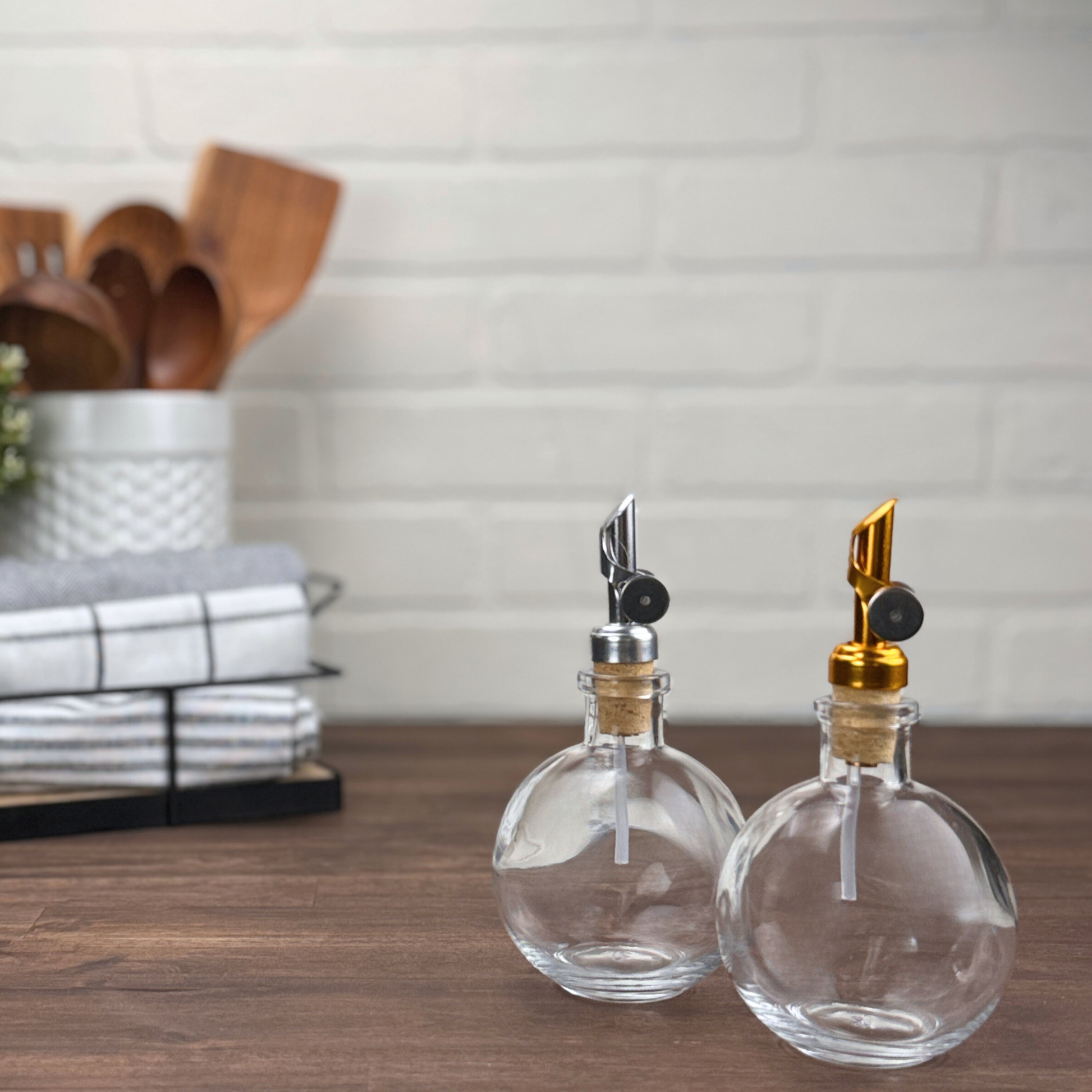 Apothecary style glass dispenser with pour spout adds organization and style to any kitchen, bathroom, or bar. Perfect for a gift or to keep for yourself! The bottle arrives empty and ready to fill!
